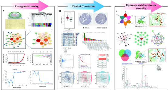 A:生姜抗胃癌的核心靶点筛选;B:核心靶点PRMT1临床相关性研究;C:PRMT1与上游转录因子EGR1及下游信号蛋白BTG2相关性研究