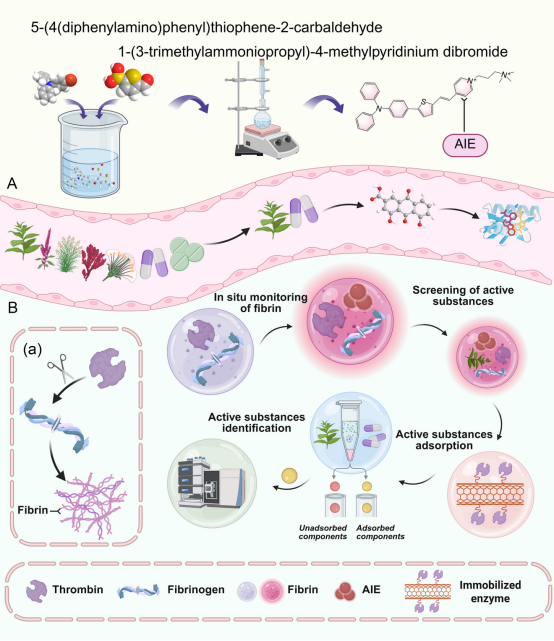 本研究聚焦心血管疾病相关的凝血酶诱导纤维蛋白聚集机制,针对传统凝血监测无法原位动态可视化、天然产物活性成分筛选效率低的问题,设计合成了AIE探针。该探针对纤维蛋白聚集体具有特异性荧光响应,且不干扰凝血酶的催化活性,其荧光信号与凝血酶活性呈正相关,实现了凝血过程的无标记原位实时监测。研究通过量子化学计算、分子动力学模拟等手段阐明了AIE探针与纤维蛋白的结合机制及AIE发光原理。基于该AIE传感体系,构建了凝血酶活性分析模型,该模型具有高特异性和抗干扰性,可定量分析凝血酶活性。为实现复杂体系中活性成分的分离,本研究以碳纳米管为载体制备了固定化酶(Thrombin@CNTs),结合亲和色谱技术建立BioSTAS技术,实现了“检测-分离”一体化的活性成分筛选平台。利用该平台对30余种天然产物及中药复方制剂进行筛选,发现2种效果较好的凝血酶抑制剂,并通过计算模拟验证了二者与凝血酶的结合机制。该工作为AIE探针在蛋白质聚集动态监测中的应用提供了新思路,也为复杂体系中活性成分的高效筛选建立了新策略,可推广至其他抑制剂的筛选。