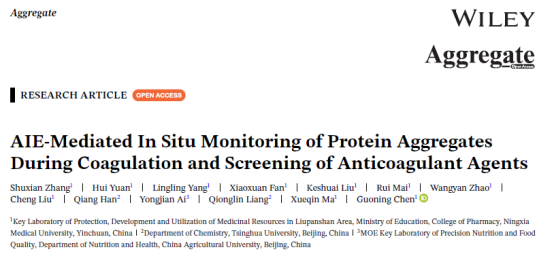 2025年12月16日,我校陈国宁副教授课题组在Aggregate期刊(IF=13.7,中科院1区,Top期刊)发表了题为AIE-Mediated In Situ Monitoring of Protein Aggregates During Coagulation and Screening of Anticoagulant Agents的研究论文,提出了一种基于AIE探针的原位监测技术,构建生物传感靶向亲和筛选(BioSTAS)平台,用于蛋白质聚集监测与抗凝活性物质筛选。