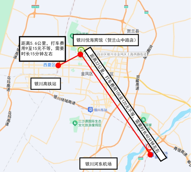 (2)银川高铁站→银川悦海宾馆:距离5.6公里,打车费用约10元,需要时长15分钟左右。