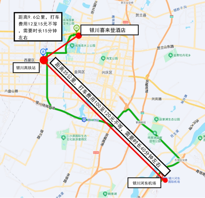 (3)公共交通:银川河东机场T3航站楼B1层→搭乘高铁前往银川站→步行约600米抵达,全程约40分钟。