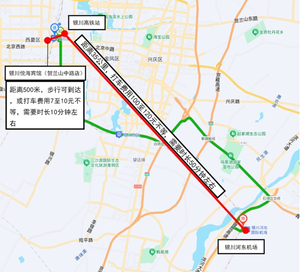 (1)银川河东机场→银川高铁站丽呈酒店:距离35公里,打车费用约100元,需要时长50分钟左右。