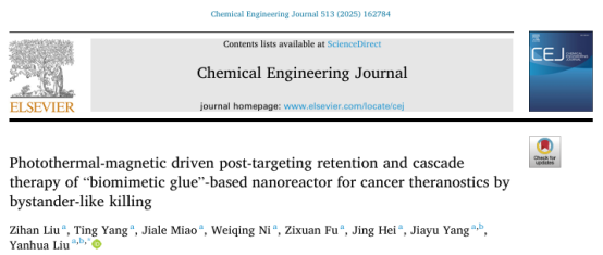 2025年6月1日,我校刘艳华课题组在Chemical Engineering Journal期刊(IF=13.2,中科院1区,Top文章)发表了题为Photothermal-magnetic driven post-targeting retention and cascade therapy of “biomimetic glue”-based nanoreactor for cancer theranostics by bystander-like killing的研究论文。